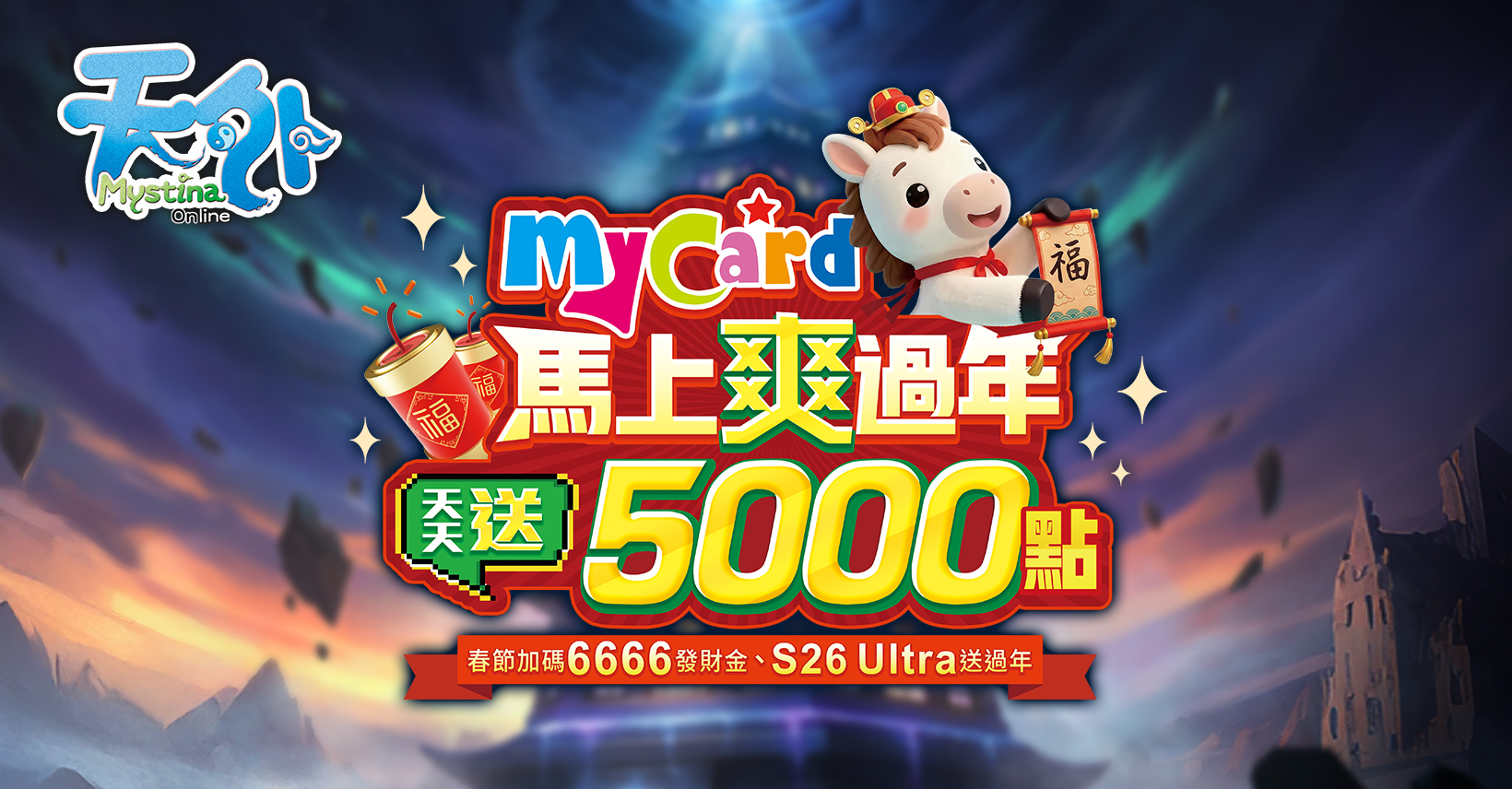 活動內容:春節期間,單筆購買MyCard 1000點(含)以上並成功儲值,再加抽發財金6666元、電競周邊、S26 Ultra等實體好禮。