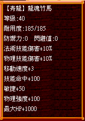 1.【青龍】系 : 移動速度+3、法術技能傷害+???%、物理技能傷害+???%,戰鬥屬性較微易出敏捷。