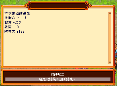 ※ 以上述範例中使用的獸之魂一為例子,當前使用的獸之魂一 75個都耗盡後,系統不會主動結束加工,也不會提示獸之魂一已耗盡,此時玩家依舊可繼續選擇加工刷洗數值,但請注意,此時加工不會自動使用其他獸之魂二...等等來提升最低下限。