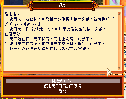 1. 玩家可將精煉次數「10以上(包含10)」的裝備,透過「NPC-造化老人」進行「精煉次數」提煉,根據裝備上的精煉次數可提煉出對應的「天工符石(精煉+??)」。