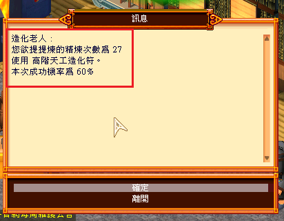 3. 選擇完畢後,會提示本次要提煉的精煉次數、使用的是哪種天工造化符、成功機率是多少。