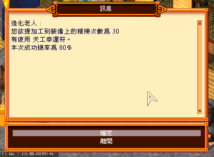 6. 選擇完畢後,會提示本次賦予加工到裝備上的精煉次數、是否有使用天工幸運符、成功機率是多少。