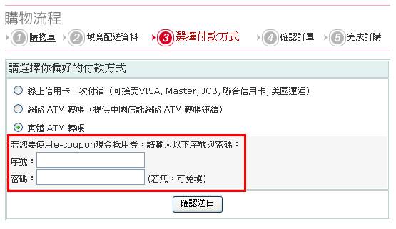 (3).填完所有配送資料後,確認送出,至以下畫面,輸入您所持有之符合抵用商品